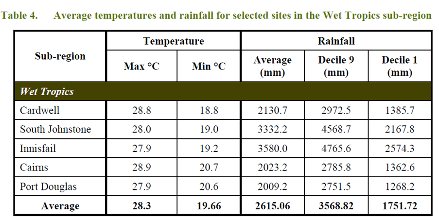 The climate of the Wet Tropics is unique in Australia. Rainfall is the distinguishing feature of the Wet Tropics. The annual rainfall is variable and seasonal and is dominated by major depressions, monsoon troughs and