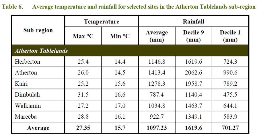 Climate (both rainfall and temperature) varies across the Atherton Tablelands as a result of the change in altitude. Areas on the Atherton Tablelands can experience occasional frosts during winter.