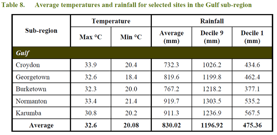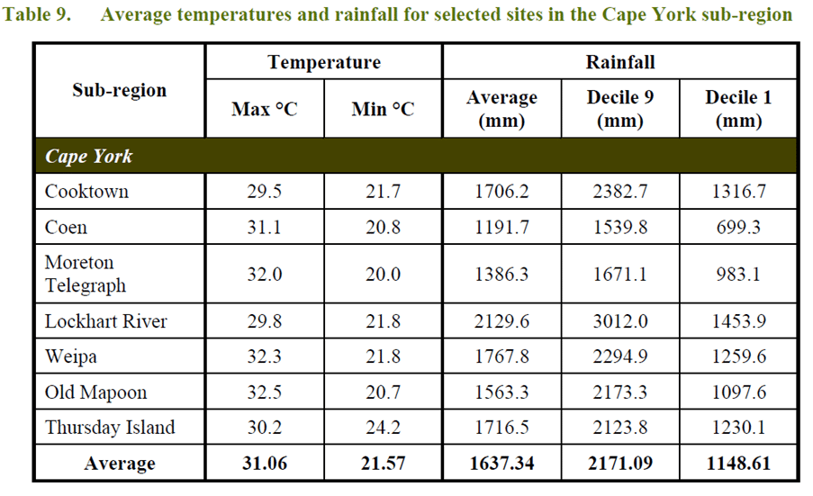 The Cape York sub-region has two distinct seasons, a reliable wet season when rainfall is received, followed by a longer dry season.